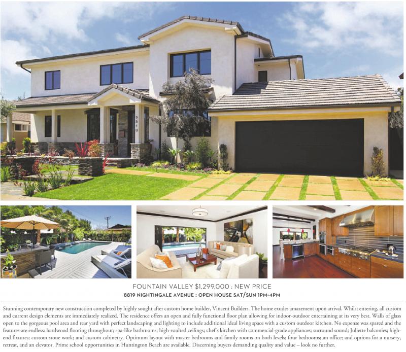 FOUNTAIN VALLEY $1,299,000 : NEW PRICE 8819 NIGHTINGALE AVENUE : OPEN HOUSE SAT/SUN 1PM-4PM Stunning contemporary new construction completed by highly sought after custom home builder, Vincent Builders. The home exudes amazement upon arrival. Whilst entering, all custom and current design elements are immediately realized. The residence offers an open and fully functional floor plan allowing for indoor-outdoor entertaining at its very best. Walls of glass open to the gorgeous pool area and rear yard with perfect landscaping and lighting to include additional ideal living space with a custom outdoor kitchen. No expense was spared and the features are endless: hardwood flooring throughout; spa-like bathrooms; high-vaulted ceilings; chef’s kitchen with commercial-grade appliances; surround sound; Juliette balconies; highend fixtures; custom stone work; and custom cabinetry. Optimum layout with master bedrooms and family rooms on both levels; four bedrooms; an office; and options for a nursery, retreat, and an elevator. Prime school opportunities in Huntington Beach are available. Discerning buyers demanding quality and value – look no further.