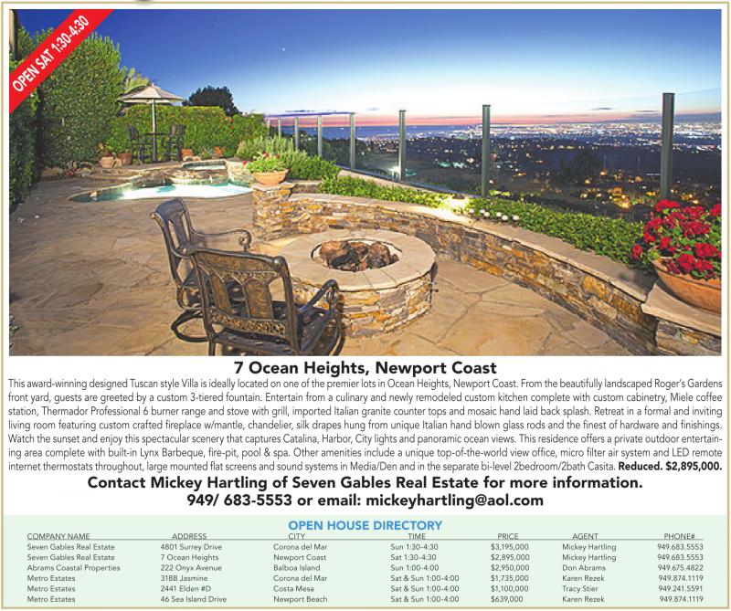 OPEN HOUSE DIRECTORY COMPANY NAME ADDRESS CITY TIME PRICE AGENT PHONE# Seven Gables Real Estate 4801 Surrey Drive Corona del Mar Sun 1:30-4:30 $3,195,000 Mickey Hartling 949.683.5553 Seven Gables Real Estate 7Ocean Heights Newport Coast Sat 1:30-4:30 $2,895,000 Mickey Hartling 949.683.5553 Abrams Coastal Properties 222 Onyx Avenue Balboa Island Sun 1:00-4:00 $2,950,000 Don Abrams 949.675.4822 Metro Estates 318B Jasmine Corona del Mar Sat &Sun 1:00-4:00 $1,735,000 Karen Rezek 949.874.1119 Metro Estates 2441 Elden #D Costa Mesa Sat &Sun 1:00-4:00 $1,100,000 Tracy Stier 949.241.5591 Metro Estates 46Sea Island Drive Newport Beach Sat &Sun 1:00-4:00 $639,000 Karen Rezek 949.874.1119