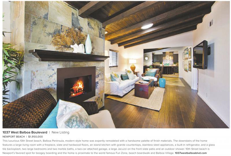 NEWPORT BEACH | $1,950,000 This luxurious 10th Street beach, Balboa Peninsula, modern style home was expertly remodeled with a handsome palette of finish materials. The downstairs of the home features a large living room with a fireplace, slate and hardwood floors, an island kitchen with granite countertops, stainless steel appliances, a built-in refrigerator, and a glass tile backsplash, two large bedrooms and two marble baths, a two-car attached garage, a large Jacuzzi on the front slate patio and an outdoor shower. 10th Street beach is Newport’s favored spot for boogey boarding and the home is proximate to the world famous Fun Zone, beach boardwalk and Balboa Village. 1037westbalboablvd.com