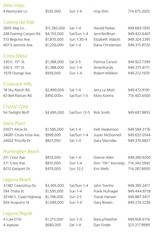 31387 Ceanothus Dr. $3,495,000 Sat/Sun 1-4 John Treviño 949.395.2417 594 Thalia St. $1,595,000 Sun 1-4 Frank Hufnagel 949.444.8718 32146 S. Coast Highway $1,198,000 Sun 2-5 Traudi Hansen 949.887.3417 934 Acapulco St. $1,099,000 Sun 1-4 Gary Boisen 949.274.2236