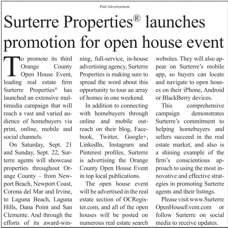 promote its third Orange County Open House Event, leading real estate firm Surterre Properties ® has launched an extensive multimedia campaign that will reach a vast and varied audience of homebuyers via print, online, mobile and social channels.