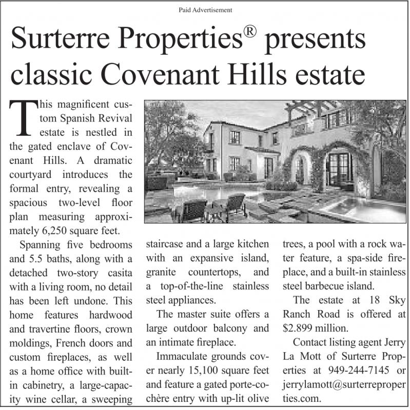 magnificent custom Spanish Revival estate is nestled in the gated enclave of Covenant Hills. A dramatic courtyard introduces the formal entry, revealing aspacious two-level floor plan measuring approximately 6,250 square feet.