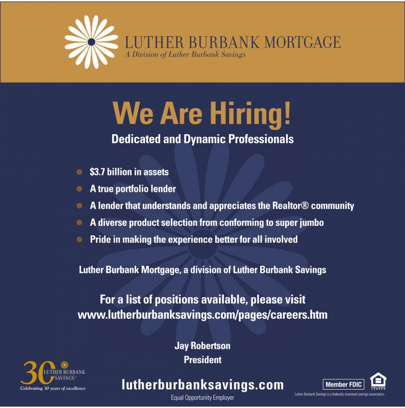 We Are Hiring! Dedicated and Dynamic Professionals $3.7 billion in assets A true portfolio lender A lender that understands and appreciates the Realtor® community A diverse product selection from conforming to super jumbo Pride in making the experience better for all involved Luther Burbank Mortgage, a division of Luther Burbank Savings Jay Robertson President Celebrating 30 years of excellence lutherburbanksavings.com Equal Opportunity Employer Member FDIC Luther Burbank Savings is afederally chartered savings association.