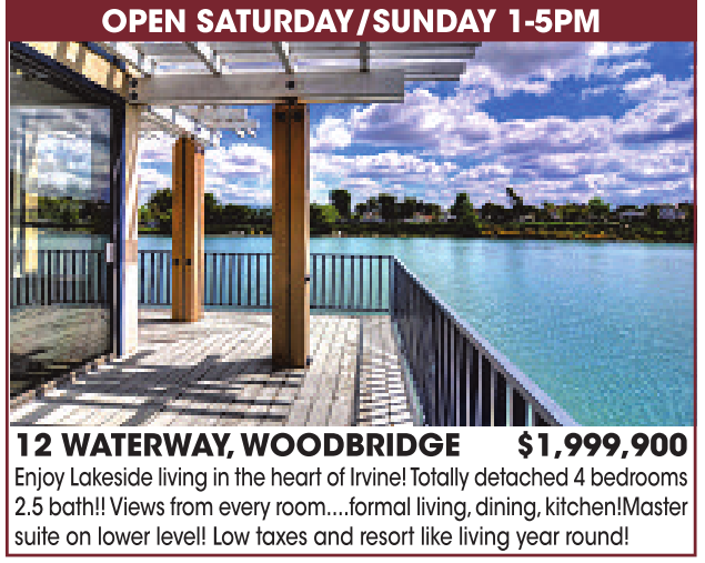 OPEN SATURDAY/SUNDAY 1-5PM 12 WATERWAY, WOODBRIDGE $1,999,900 Enjoy Lakeside living in the heart ofIrvine! Totally detached 4bedrooms 2.5 bath!! Views from every room....formal living, dining, kitchen!Master suite onlower level! Low taxes and resort like living year round! See also