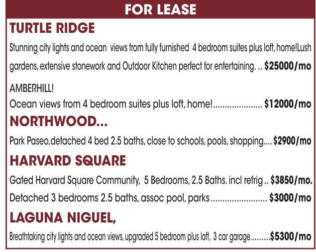 TURTLE RIDGE FOR LEASE Stunning city lights and ocean views from fully furnished 4bedroom suites plus loft, home!Lush gardens,extensive stonework and Outdoor Kitchen perfect for entertaining. .. $25000/mo AMBERHILL! Ocean views from 4bedroom suites plus loft, home!..................... $12000/mo NORTHWOOD... Park Paseo,detached 4bed 2.5 baths,close to schools,pools,shopping.... $2900/mo HARVARD SQUARE Gated Harvard Square Community, 5Bedrooms,2.5 Baths.incl refrig .. $3850/mo. Detached 3bedrooms 2.5 baths,assoc pool, parks........................ $3000/mo LAGUNA NIGUEL, Breathtaking city lights and ocean views, upgraded 5bedroom plus loft, 3car garage.........$5300/mo