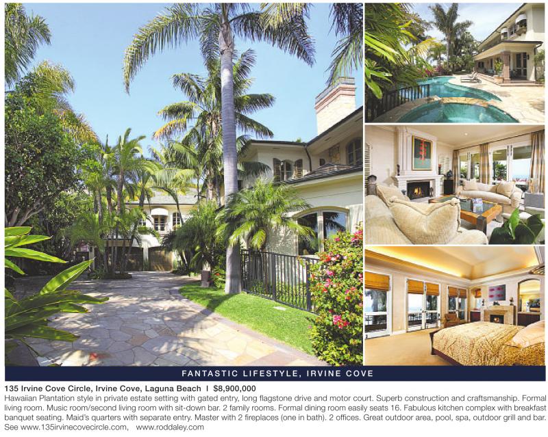 FANTASTIC LIFESTYLE, IRVINE COVE 135 Irvine Cove Circle, Irvine Cove, Laguna Beach l $8,900,000 Hawaiian Plantation style in private estate setting with gated entry, long flagstone drive and motor court. Superb construction and craftsmanship. Formal living room. Music room/second living room with sit-down bar. 2 family rooms. Formal dining room easily seats 16. Fabulous kitchen complex with breakfast banquet seating. Maid’s quarters with separate entry. Master with 2 fireplaces (one in bath). 2 offices. Great outdoor area, pool, spa, outdoor grill and bar. See www.135irvinecovecircle.com, www.roddaley.com