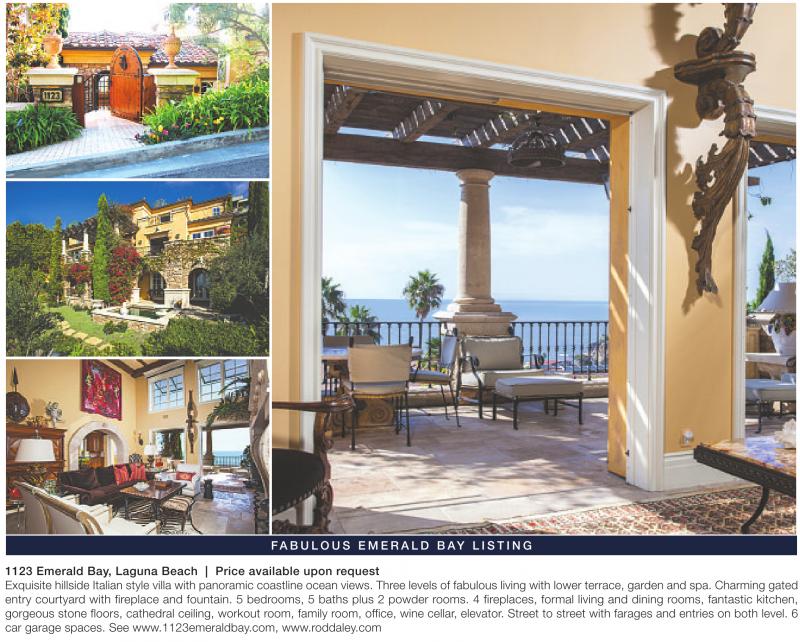 FA BULOUS EMERALD BAY L ISTING 1123 Emerald Bay, Laguna Beach | Price available upon request Exquisite hillside Italian style villa with panoramic coastline ocean views. Three levels of fabulous living with lower terrace, garden and spa. Charming gated entry courtyard with fireplace and fountain. 5 bedrooms, 5 baths plus 2 powder rooms. 4 fireplaces, formal living and dining rooms, fantastic kitchen, gorgeous stone floors, cathedral ceiling, workout room, family room, office, wine cellar, elevator. Street to street with farages and entries on both level. 6car garage spaces. See www.1123emeraldbay.com, www.roddaley.com