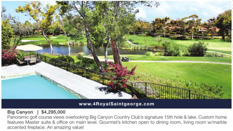 Big Canyon | $4,295,000 www.4RoyalSaintgeorge.com Panoramic golf course views overlooking Big Canyon Country Club’s signature 15th hole & lake. Custom home features Master suite & office on main level. Gourmet’s kitchen open to dining room, living room w/marble accented fireplace. An amazing value!