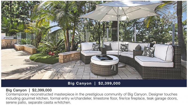 Big Canyon | $2,399,000 Big Canyon | $2,399,000 Contemporary reconstructed masterpiece in the prestigious community of Big Canyon. Designer touches including gourmet kitchen, formal entry w/chandelier, limestone floor, fire/ice fireplace, teak garage doors, serene patio, separate casita w/kitchen.