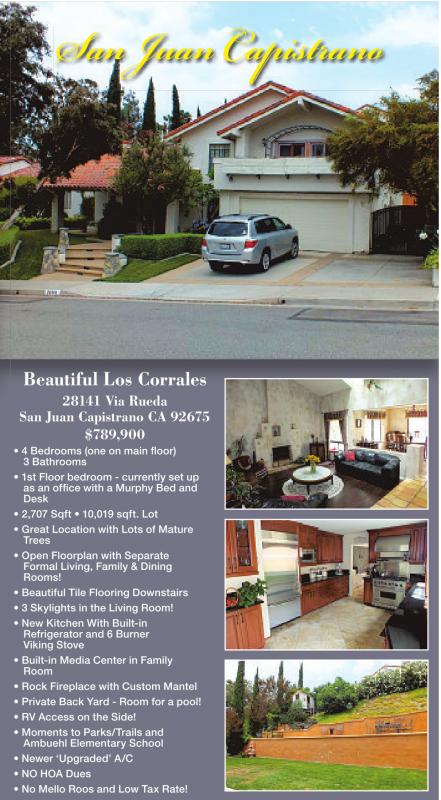 San Juan Capistrano Beautiful Los Corrales 28141 Via Rueda San Juan Capistrano CA 92675 $789,900 • 4 Bedrooms (one on main floor) 3 Bathrooms • 1st Floor bedroom - currently set up as an office with a Murphy Bed and Desk • 2,707 Sqft • 10,019 sqft. Lot • Great Location with Lots of Mature Trees • Open Floorplan with Separate Formal Living, Family & Dining Rooms! • Beautiful Tile Flooring Downstairs • 3 Skylights in the Living Room! • New Kitchen With Built-in Refrigerator and 6 Burner Viking Stove • Built-in Media Center in Family Room • Rock Fireplace with Custom Mantel • Private Back Yard - Room for a pool! • RV Access on the Side! • Moments to Parks/Trails and Ambuehl Elementary School • Newer ‘Upgraded’ A/C • NO HOA Dues • No Mello Roos and Low Tax Rate!