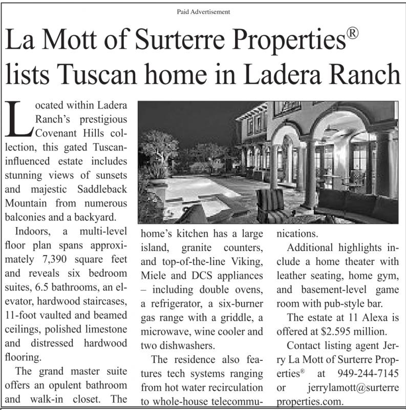within Ladera Ranch’s prestigious Covenant Hills collection, this gated Tuscaninfluenced estate includes stunning views of sunsets and majestic Saddleback Mountain from numerous balconies and a backyard.