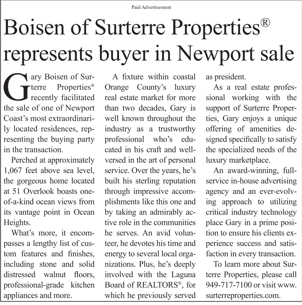 Boisen of Surterre Properties ® recently facilitated the sale of one of Newport Coast’s most extraordinarily located residences, representing the buying party in the transaction.