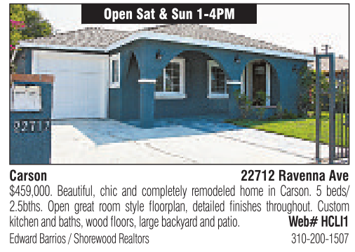 Carson Open Sat &Sun 1-4PM 22712 Ravenna Ave EdwardBarrios /Shorewood Realtors 310-200-1507 $459,000. Beautiful, chic and completely remodeled home in Carson. 5 beds/ 2.5bths. Open great room style floorplan, detailed finishes throughout. Custom kitchen and baths, wood floors, large backyardand patio. Web# HCLI1