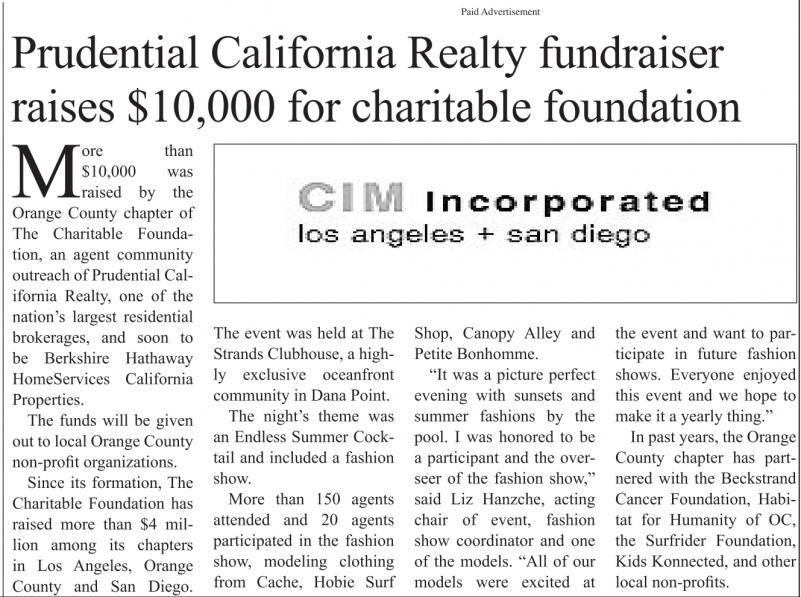than $10,000 was raised by the Orange County chapter of The Charitable Foundation, an agent community outreach of Prudential California Realty, one of the nation’s largest residential brokerages, and soon to be Berkshire Hathaway HomeServices California Properties.