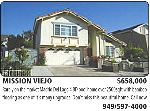 MISSION VIEJO $658,000 Rarely on themarketMadrid DelLago4BDpoolhome over2500sqftwithbamboo flooring as one of it’s many upgrades. Don’tmissthis beautifulhome.Callnow 949/597-4000