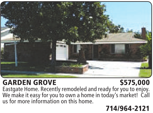 GARDEN GROVE $575,000 EastgateHome.Recentlyremodeledand readyfor youtoenjoy. We make it easyfor youtoown ahome in today’smarket! Call us formore informationonthis home.