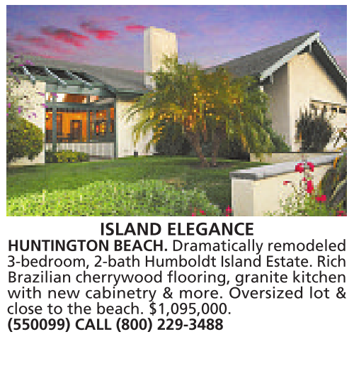 ISLAND ELEGANCE HUNTINGTONBEACH. Dramatically remodeled 3-bedroom, 2-bath Humboldt Island Estate. Rich Brazilian cherrywood flooring, granite kitchen with new cabinetry & more. Oversized lot & close to the beach. $1,095,000. (550099) CALL (800) 229-3488