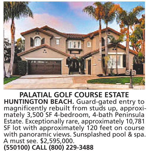PALATIAL GOLF COURSE ESTATE HUNTINGTON BEACH. Guard-gated entry to magnificently rebuilt from studs up, approximately 3,500 SF 4-bedroom, 4-bath Peninsula Estate. Exceptionally rare, approximately 10,781 SF lot with approximately 120 feet on course with panoramic views. Sunsplashed pool &spa. A must see. $2,595,000. (550100) CALL (800) 229-3488