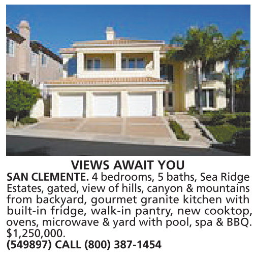 VIEWS AWAIT YOU SAN CLEMENTE. 4bedrooms, 5baths, Sea Ridge Estates, gated, view of hills, canyon &mountains from backyard, gourmet granite kitchen with built-in fridge, walk-in pantry, new cooktop, ovens, microwave &yard with pool, spa &BBQ. $1,250,000. (549897) CALL (800) 387-1454