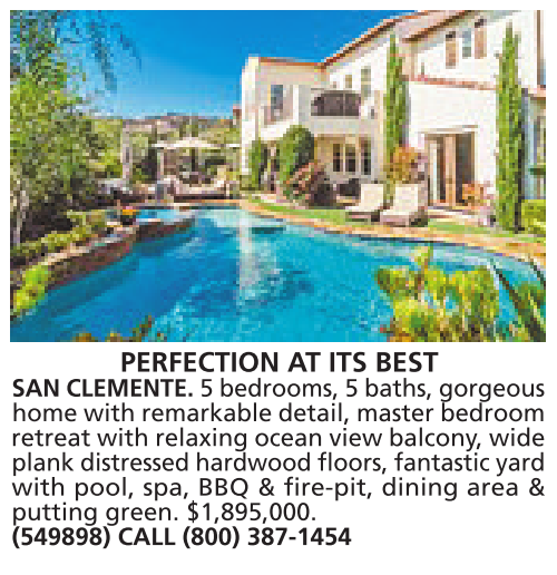 PERFECTION AT ITS BEST SAN CLEMENTE. 5bedrooms, 5baths, gorgeous home with remarkable detail, master bedroom retreatwith relaxing ocean view balcony,wide plank distressed hardwood floors, fantastic yard with pool, spa, BBQ & fire-pit, dining area & putting green. $1,895,000. (549898) CALL (800) 387-1454