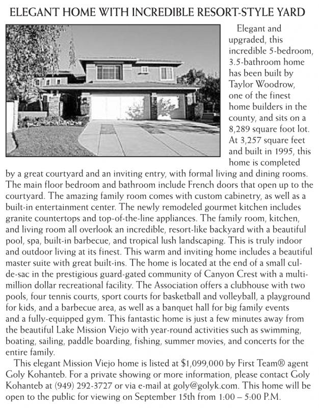 This elegant Mission Viejo home is listed at $1,099,000 by First Team® agent Goly Kohanteb. For a private showing or more information, please contact Goly Kohanteb at (949) 292-3727 or via e-mail at goly@golyk.com. This home will be open to the public for viewing on September 15th from 1:00 – 5:00 P.M.