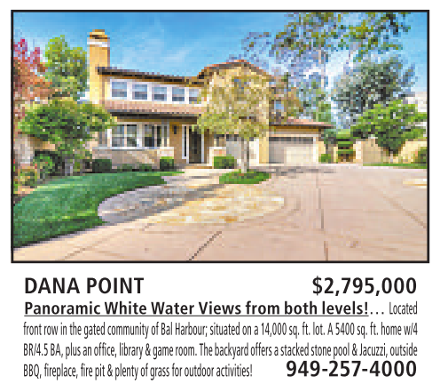 DANA POINT $2,795,000 Panoramic WhiteWater Viewsfrombothlevels!… Located front row in the gated community ofBal Harbour; situated ona14,000 sq. ft. lot. A5400 sq. ft. home w/4 BR/4.5 BA,plusanoffice,library &game room. Thebackyard offersastacked stone pool&Jacuzzi, outside BBQ,fireplace,fire pit &plentyofgrassfor outdooractivities! 949-257-4000
