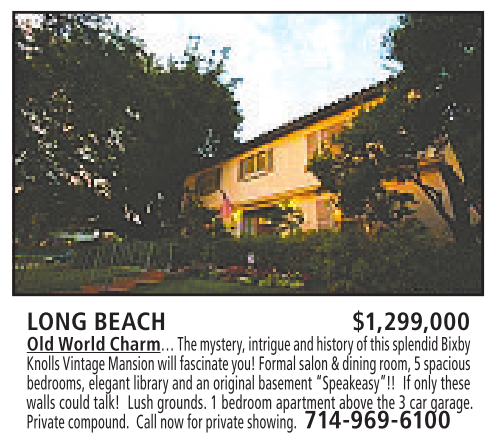 LONG BEACH $1,299,000 OldWorld Charm…The mystery, intrigue andhistory of this splendidBixby Knolls VintageMansionwill fascinate you! Formal salon&diningroom, 5spacious bedrooms, elegant library and anoriginal basement “Speakeasy”!! Ifonly these walls could talk! Lush grounds. 1bedroom apartment above the 3car garage. Privatecompound. Call nowfor privateshowing. 714-969-6100
