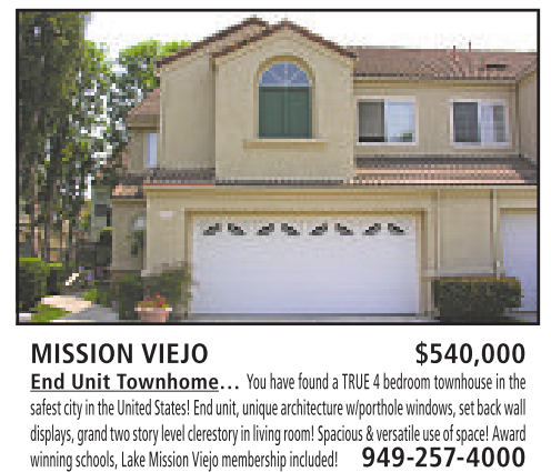 MISSION VIEJO $540,000 End Unit Townhome… You have found aTRUE 4bedroom townhouse in the safest cityinthe UnitedStates! Endunit, unique architecture w/porthole windows, set back wall displays, grandtwo storylevel clerestoryinliving room!Spacious &versatile useofspace!Award winningschools,LakeMission Viejo membershipincluded! 949-257-4000