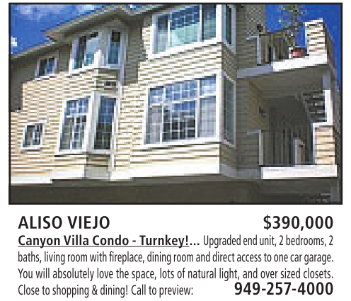 ALISO VIEJO $390,000 Canyon VillaCondo-Turnkey!... Upgraded end unit,2bedrooms,2 baths, living room with fireplace,diningroomand direct access to one cargarage. You will absolutely love the space, lots ofnatural light, and over sized closets. Close to shopping&dining! Call to preview: 949-257-4000