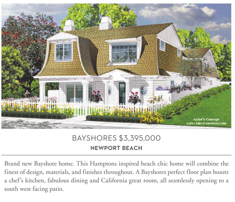 BAYSHORES $3,395,000 NEWPORT BEACH Brand new Bayshore home. This Hamptons inspired beach chic home will combine the finest of design, materials, and finishes throughout. A Bayshores perfect floor plan boasts a chef’s kitchen, fabulous dining and California great room, all seamlessly opening to a south west facing patio.