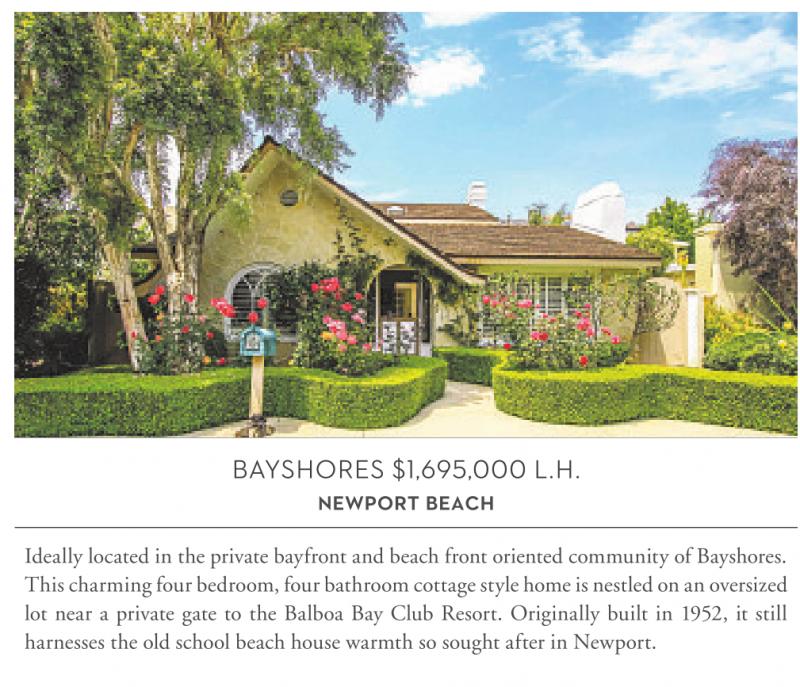 BAYSHORES $1,695,000 L.H. NEWPORT BEACH Ideally located in the private bayfront and beach front oriented community of Bayshores. This charmingfourbedroom,fourbathroomcottage style home is nestledonanoversized lot near a private gate to the Balboa Bay Club Resort. Originally built in 1952, it still harnesses the old school beach house warmth so sought after in Newport.