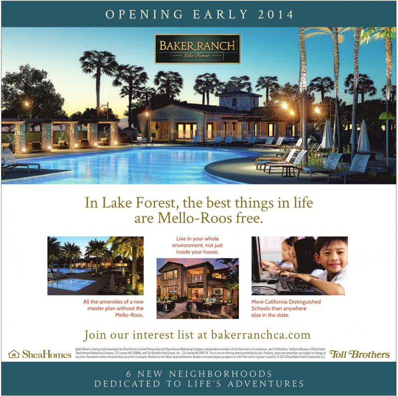 12 O P E N I N G E A R L Y 2 0 1 4 In Lake Forest, the best things in life are Mello-Roos free. Live in your whole environment, not just inside your house. All the amenities of a new master plan without the Mello-Roos. More California Distinguished Schools than anywhere else in the state. Join our interest list at bakerranchca.com Baker Ranch is being jointly developed by Shea Homes Limited Partnership and Shea Homes Marketing Company,independent members of the Shea family of companies, and Toll Brothers. California Bureau of Real Estate, Shea Homes Marketing Company,CALicense #01378646, and Toll Brothers Real Estate, Inc., CA License #01206770. This is not an offering where prohibited by law.Products, plans and amenities are subject to change at any time. Recreation center and amenities are artist’sconcepts. Models do not reflect racial preference. Brokers must accompany prospects on their first visit to register to qualify.©2013 Shea/Baker Ranch Associates LLC. 6 n e w n e i g h b o r h o o d s D E D I C A T E D T O L I F E ’ S A D V E N T U R E S