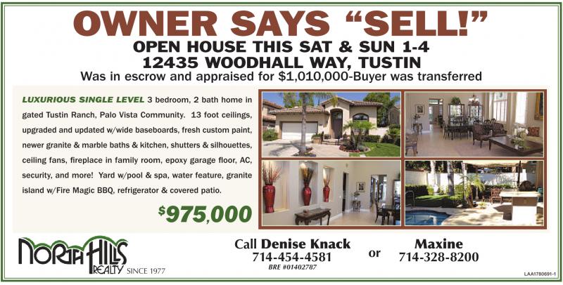 OWNER SAYS “SELL!” OPEN HOUSE THIS SAT & SUN 1-4 12435 WOODHALL WAY, TUSTIN Was in escrow and appraised for $1,010,000-Buyer was transferred LUXURIOUS SINGLE LEVEL 3 bedroom, 2 bath home in gated Tustin Ranch, Palo Vista Community. 13 foot ceilings, upgraded and updated w/wide baseboards, fresh custom paint, newer granite & marble baths & kitchen, shutters & silhouettes, ceiling fans, fireplace in family room, epoxy garage floor, AC, security, and more! Yard w/pool & spa, water feature, granite island w/Fire Magic BBQ, refrigerator & covered patio. $ 975,000 SINCE 1977 Call Denise Knack 714-454-4581 BRE #01402787 or Maxine 714-328-8200 LAA1780691-1