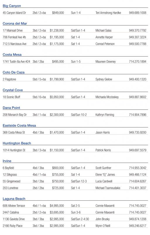 706 Fernleaf Ave#b 2bd /2+ba $1,195,000 Sat 1-4 Annette Harper 949.307.3224 712.5 Narcissus Ave 2bd /2+ba $1,175,000 Sat 1-4 Conrad Peterson 949.500.7788