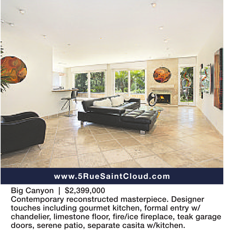 Big Canyon | $2,399,000 Contemporary reconstructed masterpiece. Designer touches including gourmet kitchen, formal entry w/ chandelier, limestone floor, fire/ice fireplace, teak garage doors, serene patio, separate casita w/kitchen.