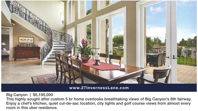 Big Canyon | $5,195,000 This highly sought after custom 5 br home overlooks breathtaking views of Big Canyon’s 8th fairway. Enjoy a chef’s kitchen, quiet cul-de-sac location, city lights and golf course views from almost every room in this uber residence.