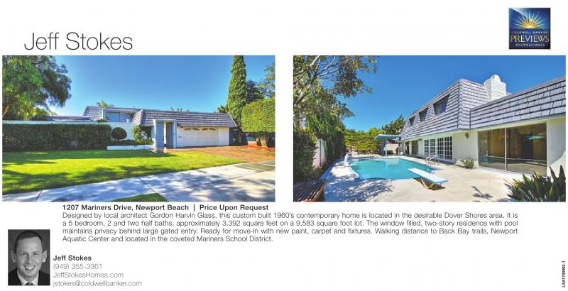 Jeff Stokes 1207 Mariners Drive, Newport Beach | Price Upon Request Designed by local architect Gordon Harvin Glass, this custom built 1960’s contemporary home is located in the desirable Dover Shores area. It is a 5 bedroom, 2 and two half baths, approximately 3,392 square feet on a 9,583 square foot lot. The window filled, two-story residence with pool maintains privacy behind large gated entry. Ready for move-in with new paint, carpet and fixtures. Walking distance to Back Bay trails, Newport Aquatic Center and located in the coveted Mariners School District. Jeff Stokes (949) 355-3361 JeffStokesHomes.com jstokes@coldwellbanker.com