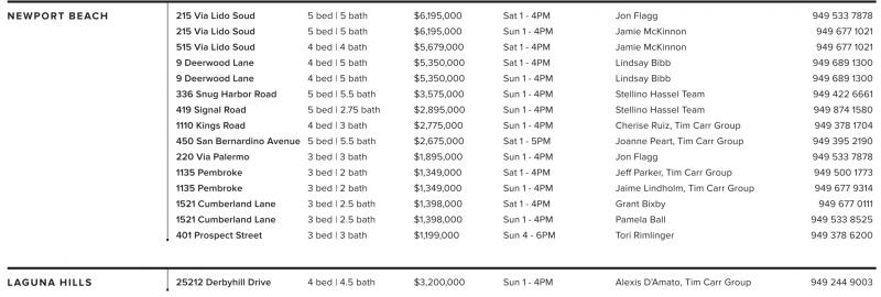NEWPORT BEACH 215 Via Lido Soud 5 bed | 5 bath $6,195,000 Sat 1 - 4PM Jon Flagg 949 533 7878 215 Via Lido Soud 5 bed | 5 bath $6,195,000 Sun 1 - 4PM Jamie McKinnon 949 677 1021 515 Via Lido Soud 4 bed | 4 bath $5,679,000 Sat 1 - 4PM Jamie McKinnon 949 677 1021 9 Deerwood Lane 4 bed | 5 bath $5,350,000 Sat 1 - 4PM Lindsay Bibb 949 689 1300 9 Deerwood Lane 4 bed | 5 bath $5,350,000 Sun 1 - 4PM Lindsay Bibb 949 689 1300 336 Snug Harbor Road 5 bed | 5.5 bath $3,575,000 Sun 1 - 4PM Stellino Hassel Team 949 422 6661 419 Signal Road 5 bed | 2.75 bath $2,895,000 Sun 1 - 4PM Stellino Hassel Team 949 874 1580 1110 Kings Road 4 bed | 3 bath $2,775,000 Sun 1 - 4PM Cherise Ruiz, Tim Carr Group 949 378 1704 450 San Bernardino Avenue 5 bed | 5.5 bath $2,675,000 Sat 1 - 5PM Joanne Peart, Tim Carr Group 949 395 2190 220 Via Palermo 3 bed | 3 bath $1,895,000 Sun 1 - 4PM Jon Flagg 949 533 7878 1135 Pembroke 3 bed | 2 bath $1,349,000 Sat 1 - 4PM Jeff Parker, Tim Carr Group 949 500 1773 1135 Pembroke 3 bed | 2 bath $1,349,000 Sun 1 - 4PM Jaime Lindholm, Tim Carr Group 949 677 9314 1521 Cumberland Lane 3 bed | 2.5 bath $1,398,000 Sat 1 - 4PM Grant Bixby 949 677 0111 1521 Cumberland Lane 3 bed | 2.5 bath $1,398,000 Sun 1 - 4PM Pamela Ball 949 533 8525 401 Prospect Street 3 bed | 3 bath $1,199,000 Sun 4 - 6PM Tori Rimlinger 949 378 6200