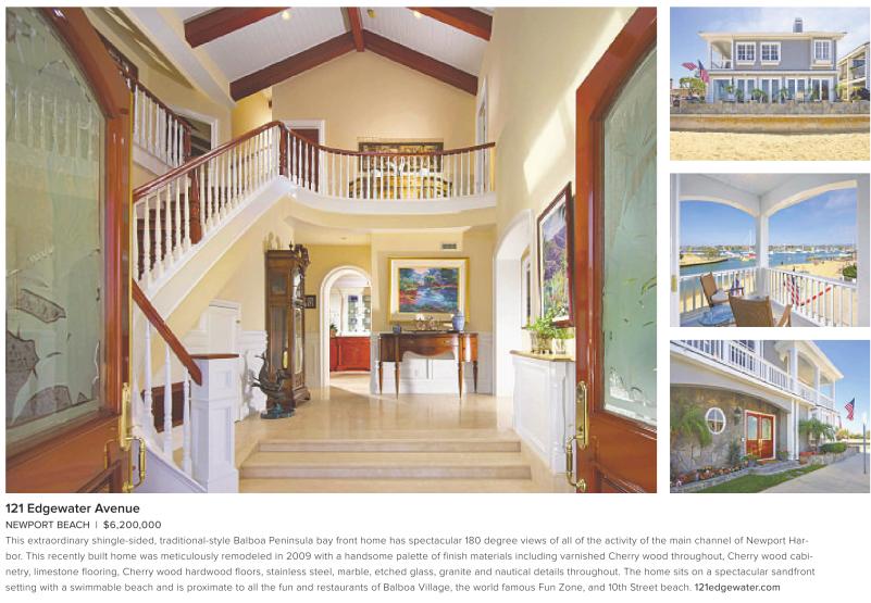 NEWPORT BEACH | $6,200,000 This extraordinary shingle-sided, traditional-style Balboa Peninsula bay front home has spectacular 180 degree views of all of the activity of the main channel of Newport Harbor. This recently built home was meticulously remodeled in 2009 with a handsome palette of finish materials including varnished Cherry wood throughout, Cherry wood cabinetry, limestone flooring, Cherry wood hardwood floors, stainless steel, marble, etched glass, granite and nautical details throughout. The home sits on a spectacular sandfront setting with a swimmable beach and is proximate to all the fun and restaurants of Balboa Village, the world famous Fun Zone, and 10th Street beach. 121edgewater.com