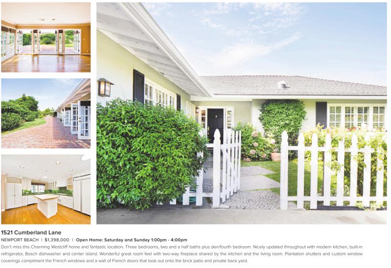 NEWPORT BEACH | $1,398,000 | Open Home: Saturday and Sunday 1:00pm - 4:00pm Don’t miss this Charming Westcliff home and fantastic location. Three bedrooms, two and a half baths plus den/fourth bedroom. Nicely updated throughout with modern kitchen, built-in refrigerator, Bosch dishwasher and center island. Wonderful great room feel with two-way fireplace shared by the kitchen and the living room. Plantation shutters and custom window coverings compliment the French windows and a wall of French doors that look out onto the brick patio and private back yard.