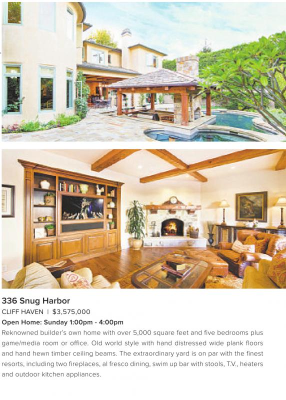 336 Snug Harbor CLIFF HAVEN | $3,575,000 Open Home: Sunday 1:00pm - 4:00pm Reknowned builder’s own home with over 5,000 square feet and five bedrooms plus game/media room or office. Old world style with hand distressed wide plank floors and hand hewn timber ceiling beams. The extraordinary yard is on par with the finest resorts, including two fireplaces, al fresco dining, swim up bar with stools, T.V., heaters and outdoor kitchen appliances.