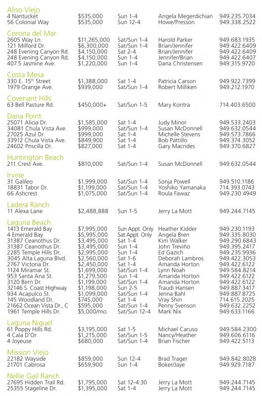 Aliso Viejo 4 Nantucket $535,000 Sun 1-4 Angela Megerdichian 949.235.7034 56 Colonial Way $535,000 Sun 12-4 Howe/Presson 949.338.2522 Corona del Mar 2605 Way Ln. $11,265,000 Sat/Sun 1-4 Harold Parker 949.683.1935 121 Milford Dr. $6,300,000 Sat/Sun 1-4 Brian/Jennifer 949.422.6409 248 Evening Canyon Rd. $4,150,000 Sat 2-4 Brian/Jennifer 949.422.6409 248 Evening Canyon Rd. $4,150,000 Sun 1-4 Jennifer/Brian 949.422.6407 407.5 Jasmine Ave. $1,220,000 Sun 1-4 Dana Christensen 949.315.9720 Costa Mesa 330 E. 15 th Street $1,388,000 Sat 1-4 Patricia Carson 949.922.7399 1979 Orange Ave. $939,000 Sat/Sun 1-4 Robert Milliken 949.212.1970 Covenant Hills 63 Bell Pasture Rd. $450,000+ Sat/Sun 1-5 Mary Kontra 714.403.6500 Dana Point 25071 Alicia Dr. $1,585,000 Sat 1-4 Judy Minor 949.533.2403 34081 Chula Vista Ave. $999,000 Sat/Sun 1-4 Susan McDonnell 949.632.0544 27025 Azul Dr. $999,000 Sat 1-4 Michelle Stevens 949.573.7866 33912 Chula Vista Ave. $849,900 Sat 1-4 Bob Pattillo 949.374.3052 24602 Priscilla Dr. $827,000 Sat 1-4 Gary Macrides 949.370.6827 Huntington Beach 211 Crest Ave. $810,000 Sat/Sun 1-4 Susan McDonnell 949.632.0544 Irvine 31 Galileo $1,999,000 Sat/Sun 1-4 Sonja Powell 949.510.1186 18831 Tabor Dr. $1,199,000 Sat/Sun 1-4 Yoshiko Yamanaka 714.393.0743 66 Ashcrest $1,075,000 Sat/Sun 1-4 Roula Fawaz 949.230.4949 Ladera Ranch 11 Alexa Lane $2,488,888 Sun 1-5 Jerry La Mott 949.244.7145 Laguna Beach 1413 Emerald Bay $7,995,000 Sun Appt. Only Heather Kidder 949.230.1193 4 Emerald Bay $5,995,000 SatAppt. Only Angela Bren 949.335.8030 31387 Ceanothus Dr. $3,495,000 Sat 1-4 Kim Walker 949.290.6843 31387 Ceanothus Dr. $3,495,000 Sun 1-4 John Treviño 949.395.2417 2285 Temple Hills Dr. $2,995,000 Sun 1-4 Ed Gazich 949.235.9936 3045 Alta Laguna Blvd. $2,560,000 Sat 1-6 Deborah Lambros 949.422.3053 2767 Victoria Dr. $2,450,000 Sat 1-4 Amanda Horton 949.422.6122 1124 Miramar St. $1,699,000 Sat/Sun 1-4 Lynn Noah 949.584.8214 953 Santa Ana St. $1,279,500 Sun 1-4 Amanda Horton 949.422.6122 3120 Bern Dr. $1,199,000 Sat/Sun 1-4 Amanda Horton 949.422.6122 32146S.Coast Highway $1,198,000 Sun 2-5 Traudi Hansen 949.887.3417 934 Acapulco St. $1,099,000 Sat/Sun 1-4 Jenna Bahl 949.887.8725 145 Woodland Dr. $745,000 Sat 1-4 Vray Shin 714.615.2025 21662Ocean Vista Dr., C $595,000 Sat/Sun 1-4 Penny Svenson 949.632.2252 1961 Temple Hills Dr. $5,000/mo. Sat/Sun 12-4 Mark Nix 949.633.1166 Laguna Niguel 61 Poppy Hills Rd. $3,195,000 Sat 1-5 Michael Caruso 949.584.2300 4 Cala D’Or $1,215,000 Sat/Sun 1-5 Nancy/Heather 949.606.6116 4 Joyeuse $680,000 Sat/Sun 1-4 Brian Fischer 949.422.5113 Mission Viejo 22182 Wayside $859,000 Sun 12-4 Brad Trager 949.842.8028 21701 Cabrosa $659,900 Sun 1-4 Boker/Jaye 949.929.7187 Nellie Gail Ranch 27695 Hidden Trail Rd. $1,795,000 Sat 12-4:30 Jerry La Mott 949.244.7145 25355 Stageline Dr. $1,395,000 Sat 1-4 Jerry La Mott 949.244.7145