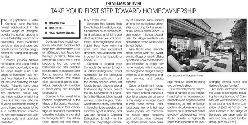 Ca (September 17, 2013) - Cambria, Irvine Pacific®’s newest neighborhood in the popular Village of Stonegate, provides the perfect opportunity to take the first step towards homeownership. These townhomes are big on style and value, and provide roomy floorplan designs perfect for young and growing families.