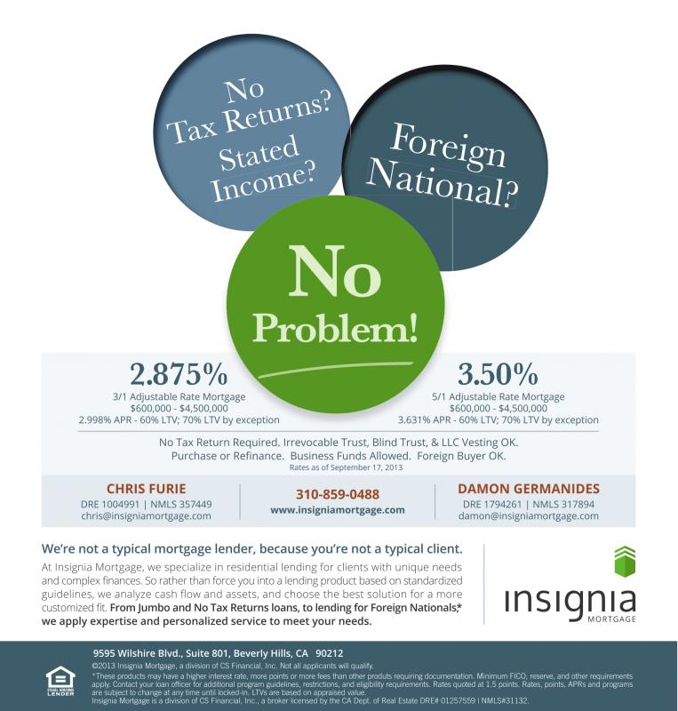 ©2013 Insignia Mortgage, a division of CS Financial, Inc. Not all applicants will qualify. *These products may have ahigher interest rate, more points or more fees than other produts requiring documentation. Minimum FICO, reserve, and other requirements apply. Contact your loan officer for additional program guidelines, restrictions, and eligibility requirements. Rates quoted at 1.5 points. Rates, points, APRs and programs are subject to change at any time until locked-in. LTVs are based on appraised value. Insignia Mortgage is a division of CS Financial, Inc., a broker licensed by the CA Dept. of Real Estate DRE# 01257559 | NMLS#31132.