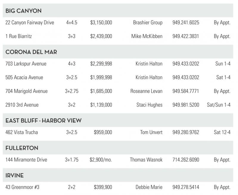 BIG CANYON 22 Canyon Fairway Drive 4+4.5 $3,150,000 Brashier Group 949.241.6025 By Appt. 1Rue Biarritz 3+3 $2,439,000 Mike McKibben 949.422.3831 By Appt. CORONA DEL MAR 703 Larkspur Avenue 4+3 $2,299,998 Kristin Halton 949.433.0202 Sun 1-4 505 Acacia Avenue 3+2.5 $1,999,998 Kristin Halton 949.433.0202 Sat 1-4 704 Marigold Avenue 3+2.75 $1,685,000 Roseanne Levan 949.584.7771 By Appt. 2910 3rd Avenue 3+2 $1,139,000 Staci Hughes 949.981.5200 Sat/Sun 1-4 EASTBLUFF -HARBOR VIEW 462 Vista Trucha 3+2.5 $959,000 TomUnvert 949.280.9762 Sat 12-4 FULLERTON 144 Miramonte Drive 3+1.75 $2,900/mo. Thomas Wasnok 714.262.6090 By Appt. IRVINE 43 Greenmoor #3 2+2 $399,900 Debbie Marie 949.278.5414 By Appt.