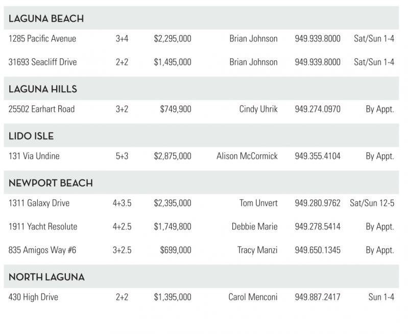 1285 Pacific Avenue 3+4 $2,295,000 Brian Johnson 949.939.8000 Sat/Sun 1-4 31693 Seacliff Drive 2+2 $1,495,000 Brian Johnson 949.939.8000 Sat/Sun 1-4 GUNA HILLS 25502 Earhart Road 3+2 $749,900 Cindy Uhrik 949.274.0970 By Appt. LIDO ISLE 131 ViaUndine 5+3 $2,875,000 Alison McCormick 949.355.4104 By Appt. NEWPORTBEACH 1311 Galaxy Drive 4+3.5 $2,395,000 TomUnvert 949.280.9762 Sat/Sun 12-5 1911 Yacht Resolute 4+2.5 $1,749,800 Debbie Marie 949.278.5414 By Appt. 835 Amigos Way#6 3+2.5 $699,000 Tracy Manzi 949.650.1345 By Appt. NORTH GUNA 430 High Drive 2+2 $1,395,000 Carol Menconi 949.887.2417 Sun 1-4