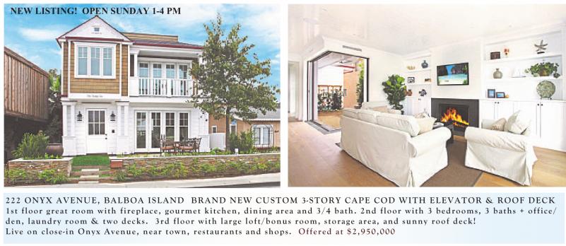 NEW LISTING! OPEN SUNDAY 1-4 PM 222 ONYX AVENUE, BALBOA ISLAND BRAND NEW CUSTOM 3-STORY CAPE COD WITH ELEVATOR & ROOF DECK 1st floor great room with fireplace, gourmet kitchen, dining area and 3/4 bath. 2nd floor with 3 bedrooms, 3 baths + office/ den, laundry room & two decks. 3rd floor with large loft/bonus room, storage area, and sunny roof deck! Live on close-in Onyx Avenue, near town, restaurants and shops. Offered at $2,950,000