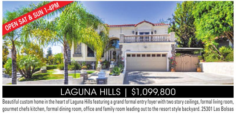 LAGUNA HILLS | $1,099,800 Beautifulcustomhomeinthe heartofLagunaHills featuringagrand formal entryfoyer with twostory ceilings,formalliving room, gourmetchefs kitchen,formaldiningroom,office andfamilyroom leadingout to theresortstyle backyard. 25301Las Bolsas