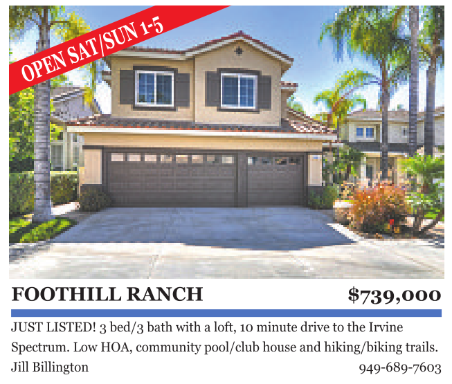 JUST LISTED! 3bed/3 bath with aloft, 10 minute drive to the Irvine Spectrum. Low HOA, community pool/club house and hiking/biking trails. Jill Billington 949-689-7603