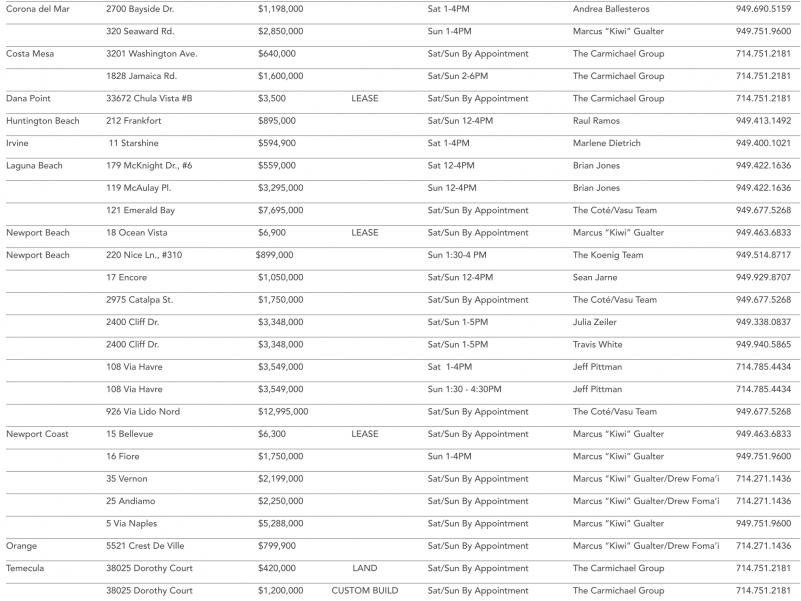 Irvine 11 Starshine $594,900 Sat 1-4PM Marlene Dietrich 949.400.1021 Laguna Beach 179 McKnight Dr., #6 $559,000 Sat 12-4PM Brian Jones 949.422.1636 119 McAulay Pl. $3,295,000 Sun 12-4PM Brian Jones 949.422.1636 121 Emerald Bay $7,695,000 Sat/Sun By Appointment The Coté/Vasu Team 949.677.5268 Newport Beach 18 Ocean Vista $6,900 LEASE Sat/Sun By Appointment Marcus “Kiwi” Gualter 949.463.6833 Newport Beach 220 Nice Ln., #310 $899,000 Sun 1:30-4 PM The Koenig Team 949.514.8717 17 Encore $1,050,000 Sat/Sun 12-4PM Sean Jarne 949.929.8707 2975 Catalpa St. $1,750,000 Sat/Sun By Appointment The Coté/Vasu Team 949.677.5268 2400 Cliff Dr. $3,348,000 Sat/Sun 1-5PM Julia Zeiler 949.338.0837 2400 Cliff Dr. $3,348,000 Sat/Sun 1-5PM Travis White 949.940.5865 108 Via Havre $3,549,000 Sat 1-4PM Jeff Pittman 714.785.4434 108 Via Havre $3,549,000 Sun 1:30 - 4:30PM Jeff Pittman 714.785.4434 926 Via Lido Nord $12,995,000 Sat/Sun By Appointment The Coté/Vasu Team 949.677.5268 Newport Coast 15 Bellevue $6,300 LEASE Sat/Sun By Appointment Marcus “Kiwi” Gualter 949.463.6833 16 Fiore $1,750,000 Sun 1-4PM Marcus “Kiwi” Gualter 949.751.9600 35 Vernon $2,199,000 Sat/Sun By Appointment Marcus “Kiwi” Gualter/Drew Foma’i 714.271.1436 25 Andiamo $2,250,000 Sat/Sun By Appointment Marcus “Kiwi” Gualter/Drew Foma’i 714.271.1436 5 Via Naples $5,288,000 Sat/Sun By Appointment Marcus “Kiwi” Gualter 949.751.9600 Orange 5521 Crest De Ville $799,900 Sat/Sun By Appointment Marcus “Kiwi” Gualter/Drew Foma’i 714.271.1436 Temecula 38025 Dorothy Court $420,000 LAND Sat/Sun By Appointment The Carmichael Group 714.751.2181 38025 Dorothy Court $1,200,000 CUSTOM BUILD Sat/Sun By Appointment The Carmichael Group 714.751.2181